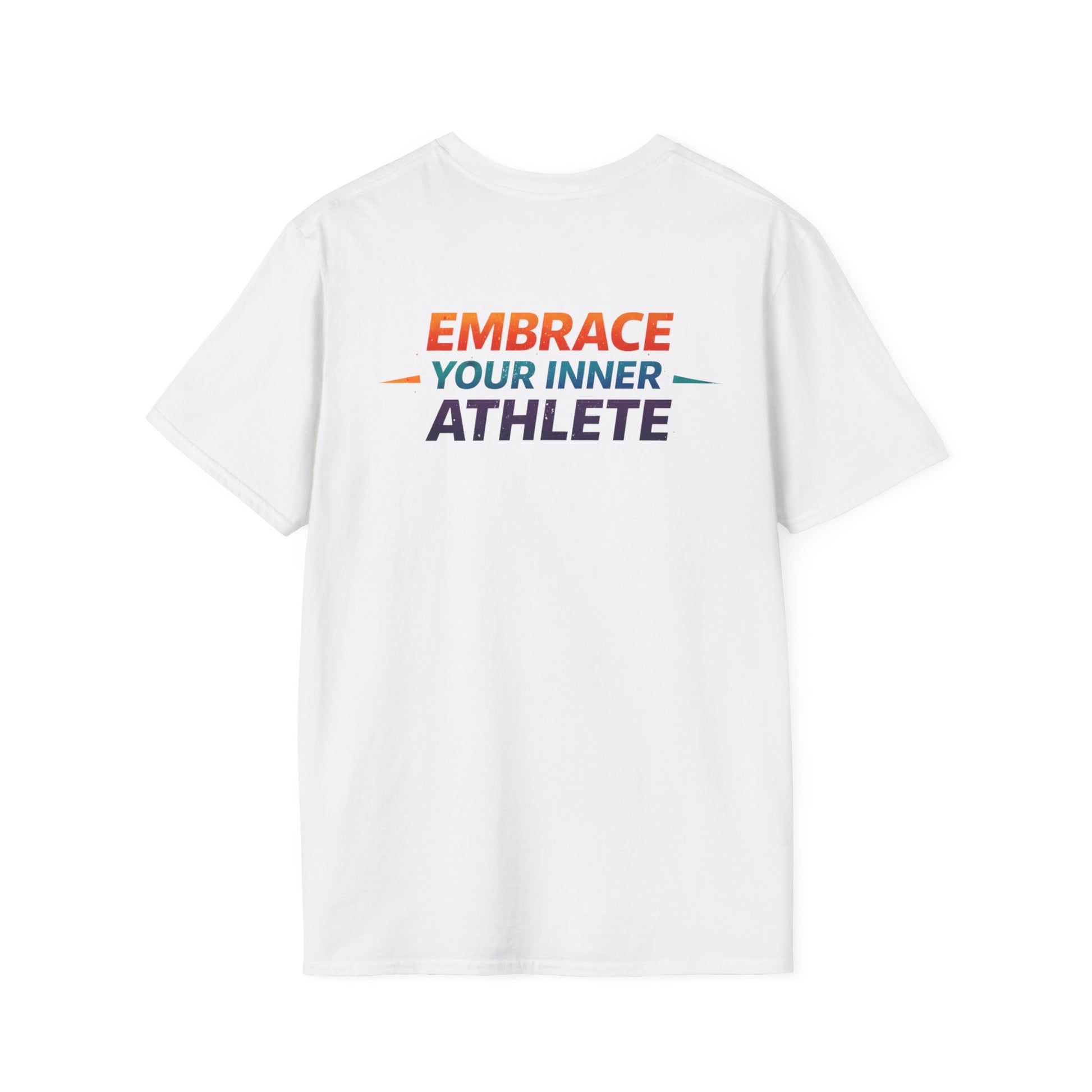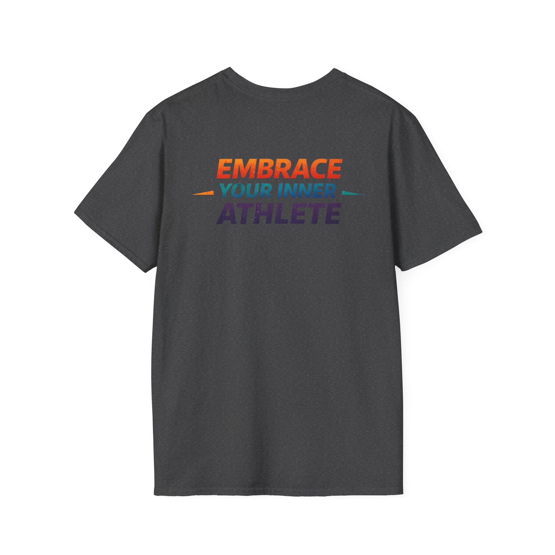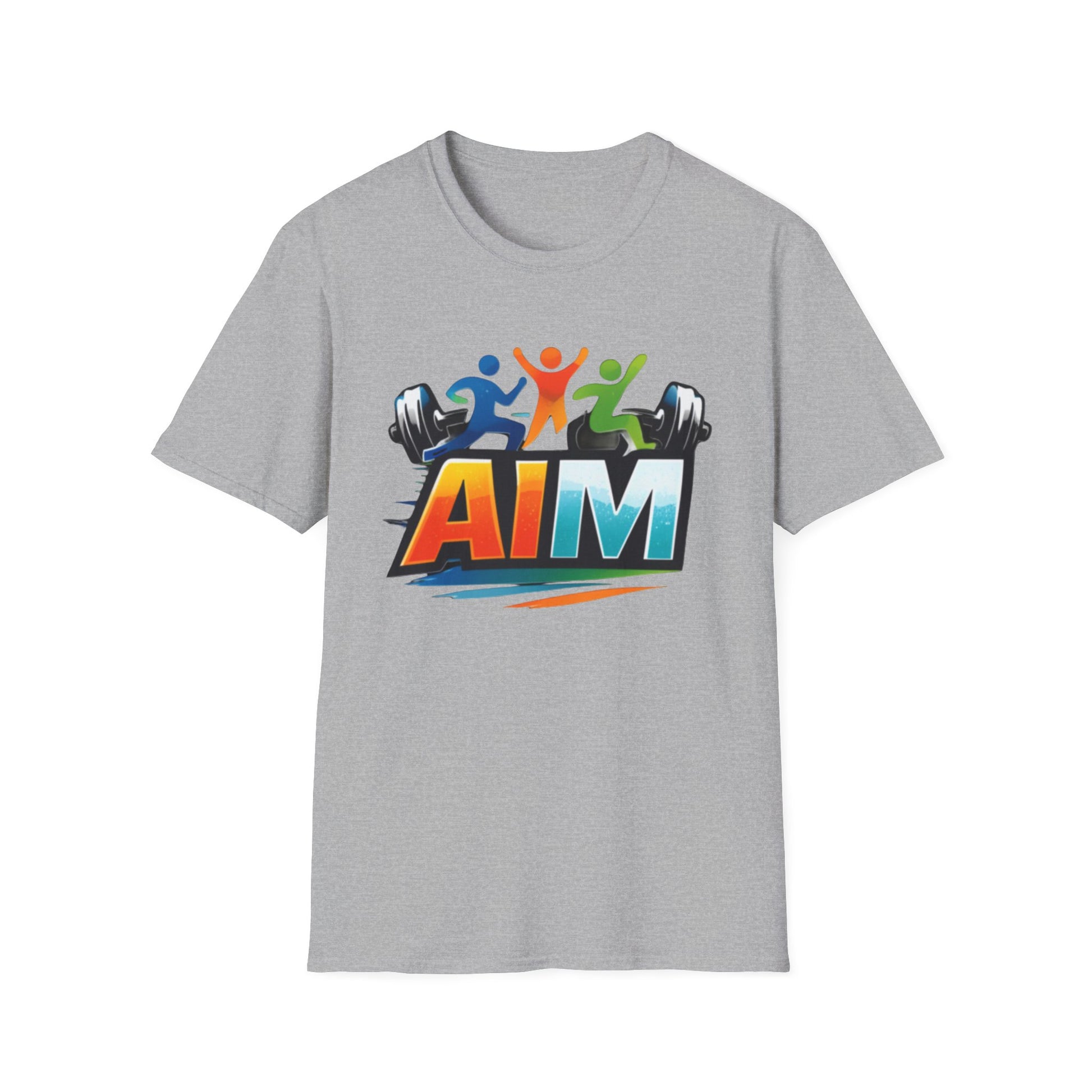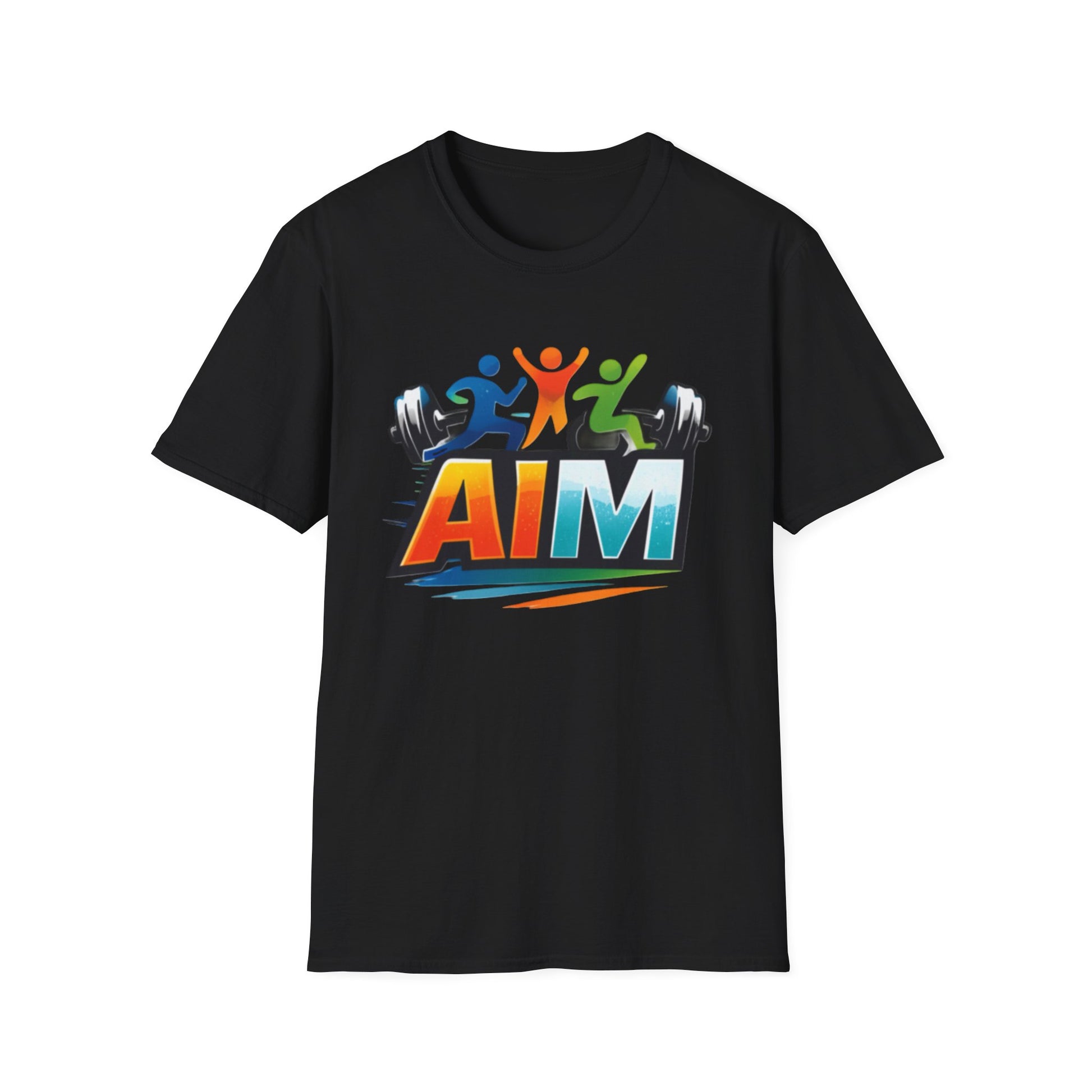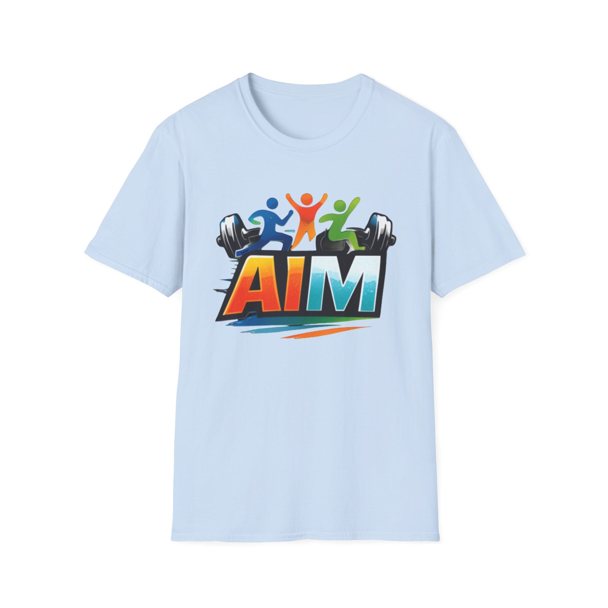 A lightweight, breathable tee designed for movement and motivation. Front artwork features a bold, colorful "AIM" logo with dynamic figures and dumbbells—an energetic emblem for people who train, coach, or cheer on others. The back reads "EMBRACE YOUR INNER ATHLETE" in contrasting colors, a short, confident message that sits cleanly across the shoulders. The smooth ring-spun cotton feels soft against skin and lays flat under layers. Wear it to warm-ups, outdoor workouts, or meetups with your training crew—the shirt moves with you and keeps the message front and center.